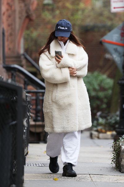 Знаменитость была одна, когда в дождливый день несла в руках две маленькие мятно-зеленые чашки кофе. К образу она добавила темную бейсболку и держала в руках телефон в какой-то момент.