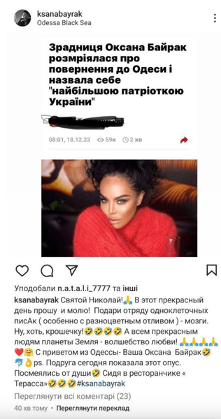Телеведущая сначала опубликовала пост в соцсети с геолокацией "Одесса", однако впоследствии его удалила. Байрак призналась, что на День святого Николая 19 декабря приехала в Украину и посмеялась над украинскими СМИ, которые называли ее предательницей.