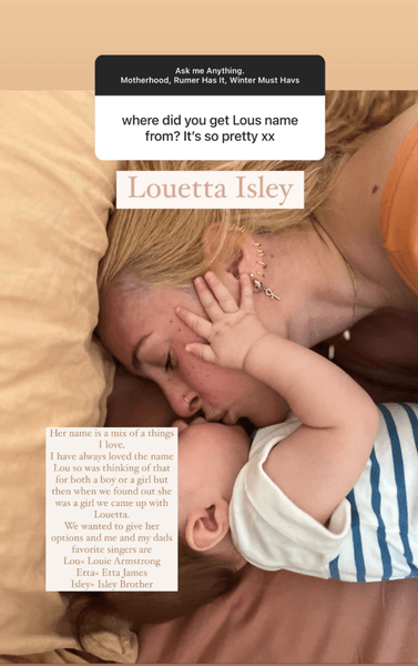 "Ее имя — это смесь вещей, которые я люблю", — объяснил Румер. "Мне всегда нравилось имя Лу, поэтому я думала о нем как для мальчика, так и для девочки, но потом, когда мы узнали, что она девочка, мы придумали Луэтту".