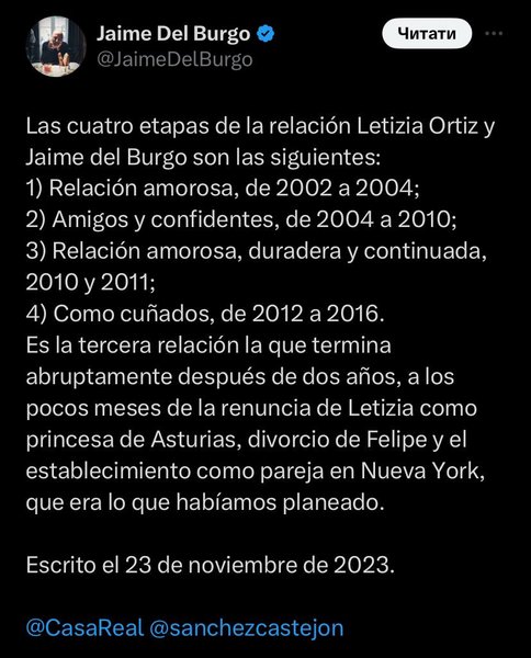 Бывший вероятный любовник королевы Испании Летиции Хайме дель Бурго раскрывает новые детали их романа. Об этом испанский бизнесмен рассказал в своем Х-аккаунте (ранее Twitter).