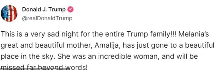 "Это очень печальная ночь для всей семьи Трампов! Великая и прекрасная мать Мелании, Амалия, только что отправилась в прекрасное место на небе. Она была невероятной женщиной, и ее будет не хватать!" – написал он.