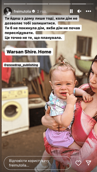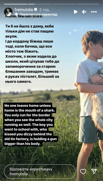 Семейные кадры телеведущая сопроводила строками из стихотворения британской поэтессы Варсан Шайр — "Home". По словам многодетной мамы, поэзия ее настолько растрогала, что она не могла ею не поделиться. А особенно звезду экрана потрясло то, что лирика перекликается с событиями в Украине, когда людям из-за войны пришлось покидать свои дома.