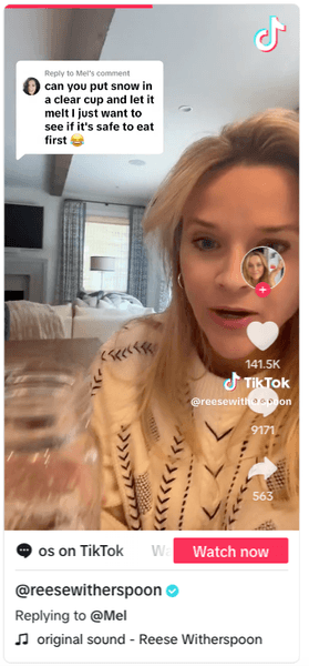 Однако Риз Уизерспун не преминула ответить на шумиху, поднявшуюся вокруг ее видео, и уже 19 января она опубликовала новое видео. Актриса рассказала, что многие подписчики TikToka предложили ей растопить в микроволновке чашку снега и посмотреть, сколько грязи останется на дне.
