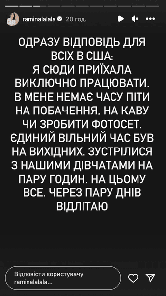 "Я сюда приехала исключительно работать. У меня нет времени пойти на свидание, на кофе или сделать фотосет", — отметила Рамина.