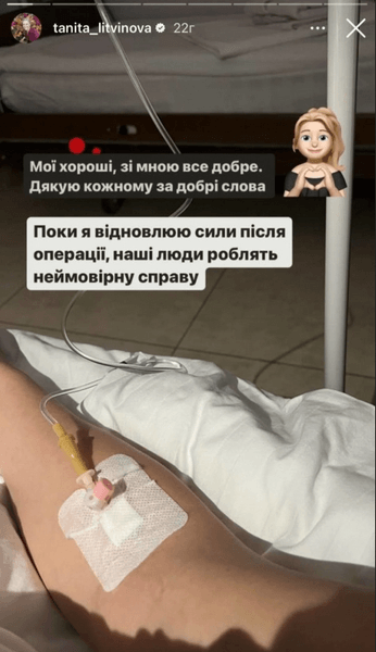 Она опубликовала инстаграм-сторис из больничной палаты после хирургической операции, у нее в руке стоит капельница.