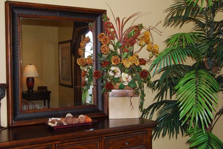 В спальне можно размещать любую флору, ориентируясь прежде всего на предпочтения ее основных обитателей. В просторной комнате хорошо смотрятся напольные стабилизированные растения, которые размещены в стильных вазонах.