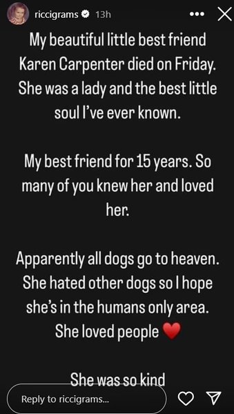 "Моя прекрасная маленькая лучшая подруга Карен Карпентер умерла в пятницу. Она была женщиной и лучшей маленькой душой, которую я когда-либо знала. Мой лучший друг на протяжении 15 лет. Многие из вас знали ее и любили ее. Очевидно, все собаки попадают в рай. Она ненавидела других собак, поэтому я надеюсь, что она находится в зоне, предназначенной только для людей. Она любила людей. Она была так добра", – написала Кристина.