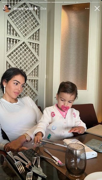Почти двухлетняя Белла Эсмеральда сидела у мамы на руках и училась пользоваться столовыми приборами. Самая маленькая наследница португальского футболиста была одета в светлый костюмчик и держала во рту розовую соску.