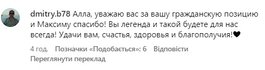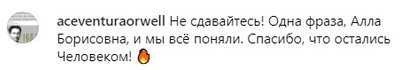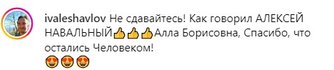"Он не сдавался и мы не сдадимся!", "Не сдавайтесь! Одна фраза, Алла Борисовна, и мы все поняли. Спасибо, что остались Человеком!", "Не сдавайтесь! Как говорил Алексей Навальный! Алла Борисовна, спасибо, что остались Человеком!", "Алла, уважаю вас за вашу гражданскую позицию и Максиму спасибо! Вы легенда и такой будете для нас всегда! Удачи вам, счастья, здоровья и благополучия!", – пишут поклонники артистки.