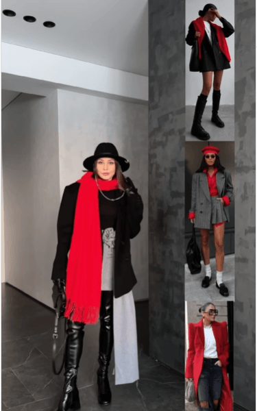 Красный и ахроматические цвета — это отличное сочетание для создания стильного и современного дизайна. Красный считается энергичным и страстным цветом, тогда как ахроматические цвета, такие как черный, серый или белый, придают спокойствие и сбалансированность. Комбинирование этих цветов может создать динамичный контраст в вашем образе.