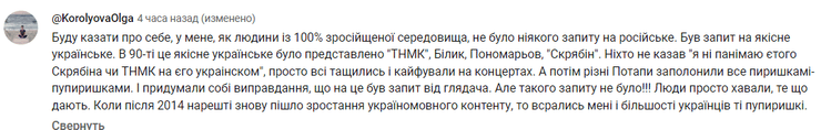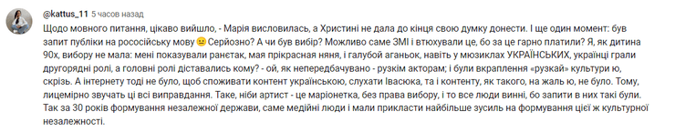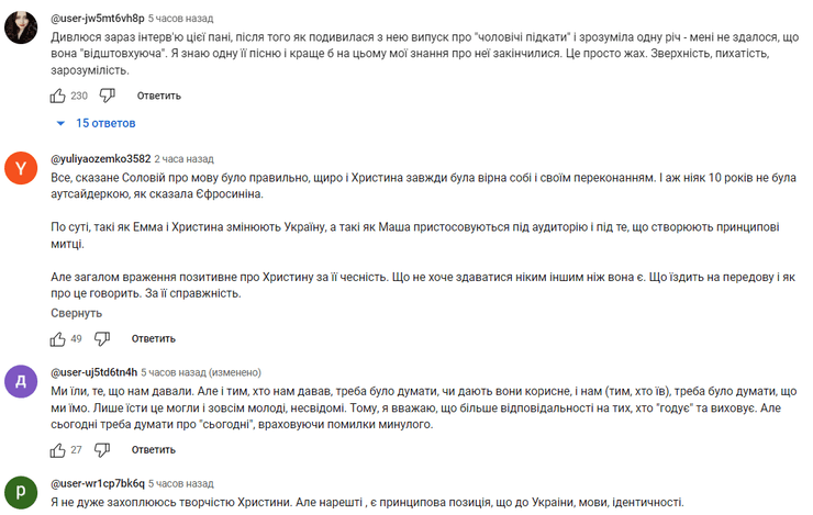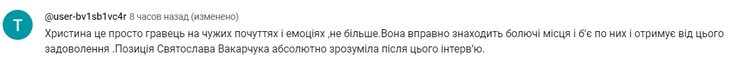 "Христина это просто игрок на чужих чувствах и эмоциях, не больше. Она умело находит болезненные места и бьет по ним и получает от этого удовольствие. Позиция Святослава Вакарчука абсолютно понятна после этого интервью", "Буду говорить о себе, у меня, как человека из 100% обросшей среды, не было никакого запроса на русское. Был запрос на качественное украинское. В 90-е это качественное украинское было представлено "ТНМК", Билык, Пономарев, "Скрябин". Никто не говорил "я не понимаю этого Скрябина или ТНМК на его украинском", просто все тащились и кайфовали на концертах. А потом разные потапы заполонили все пырышками-пупырышками. И придумали оправдание, что на это был запрос от зрителя. Но такого запроса не было! Люди просто хавали то, что дают. Когда после 2014 наконец снова пошел рост украиноязычного контента, то вс*ались мне и большинству украинцев эти пупырышки", "Что касается языкового вопроса, интересно получилось, – Мария высказалась, а Христине не дала до конца свою мысль донести. И еще один момент: был запрос публики на русский язык. Серьезно? Был ли выбор? Возможно, именно СМИ и втюхивали это, потому что за это хорошо платили? Я, как ребенок 90-х, выбора не имела: мне показывали ранеток, моя прекрасная няня, и голубой огонек, даже в мюзиклах УКРАИНСКИХ украинцы играли второстепенные роли, а главные роли доставались кому? — ой, как непредсказуемо – русским актерам…", "Первый раз смотрю выпуск и меня не тошнит от тех зефирных страданий, сладенького литья багульника в наши уши. Мы так привыкли, что все артисты прекрасны, что это интервью просто швырнуло розовые очки прочь. Спасибо Марии и Кристине, что были такими, как есть", "Христина очень тяжелый человек, как я вижу. Такая растопчет и пойдет дальше. Я понимаю, почему с Вакарчуком у нее не сложилось работать и почему он перестал с ней общаться. Немного человечности нужно иметь", – пишут под видео.
