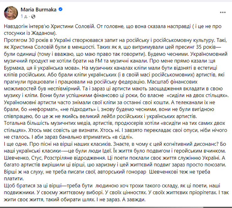 "Дорогие друзья и недруги, поклонники и хейтеры! Разговаривать на русском — ваше законное право, которое еще и защищено Конституцией Украины. В интервью я говорю исключительно о медийных людях, которые после 2014 года продолжали создавать русский мир в Украине своим творчеством, своим трудом", – заявила она.