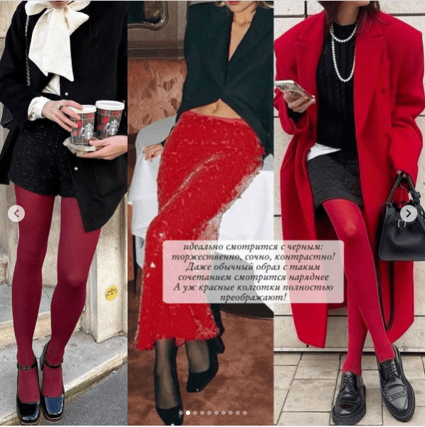 Не для кого не секрет, что красный идеально смотрится в сочетании с черным: празднично, сочно, уверенно. Даже обычный образ в таком сочетании выглядит стильно. Сочетание красного и черного цветов в одежде может создавать стильный и выразительный образ. Например, можно сочетать красное платье с черными туфлями и аксессуарами, или черные брюки с красным топом. А красные колготки, это вообще взрыв в этом сезоне. Они выглядят очень смело, сексуально и уверенно.