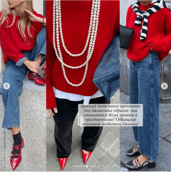 Цвет красного и денима — очень популярное сочетание в одежде. Например, красная рубашка или свитер может быть красивой парой к джинсам. Также можно попробовать совместить красный аксессуар, например, шарф или пояс, с джинсами. Это создаст яркий и стильный образ. Именно поэтому любителям джинсов стоит обратить внимание на это сочетание цветов. Именно красный в сочетании с джинсом придает им интересный и необычный вид.