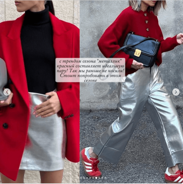 Уже всем известно, что цвет металлика один из главных трендов этого сезона. Поэтому уверенно можете комбинировать его с красным. Как правило, сочетание красного цвета с металликом выглядит достаточно стильно и современно. Например, красные акценты или детали в сочетании с металлическими тканями могут добавить яркости и индивидуальности к вашему образу. Возможные варианты этого сочетания включают красные металлические юбки, платья, блузки или аксессуары, такие как сумки или обувь. Насколько креативный ваш образ будет зависеть от вашего личного стиля и предпочтений.