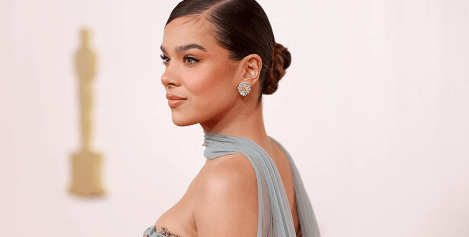 27-летняя американская актриса фильма "Человека-паука: Через вселенные" вышла на красную дорожку в потрясающем платье со слоями светло-голубого шифона, украшенного золотом. Платье без бретелек имело блестящие позолоченные цветочные детали на лифе, которые уступили место плиссированной юбке с несколькими слоями прозрачной ткани. Мотив с позолоченными листьями повторялся на манжетах, которые прикреплялись к нескольким полоскам прозрачного голубого шифона, что давало Стайнфель пару крыльев, когда она поднимала руки. В завершение платья артистка надела на шею длинный шарф, хвостики которого шлейфом стелились за спиной. Андре Тан так прокомментировал ее образ: "Вау! Очень красивый образ!"