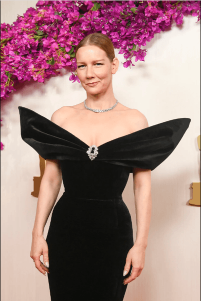 38-летняя актриса Кэри Маллиган на церемонию Оскар надела длинное платье фасона "русалка". Платье было пошито в черно-белых цветах из бархата и фатина. Оно обтягивало фигуру актрисы и имело декольте в форме сердца, а сзади — немного открытую спину. Андре Тан назвал образ актрисы изысканным.