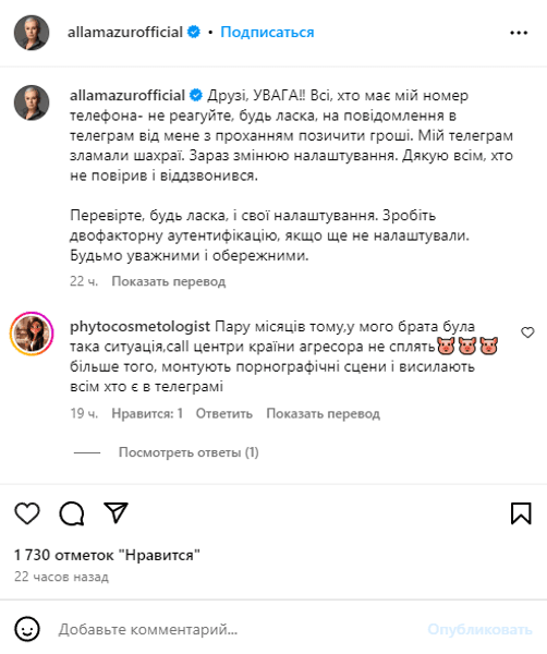 "Мой Телеграм взломали мошенники. Сейчас меняю настройки. Спасибо всем, кто не поверил и отзвонился", — написала Мазур.
