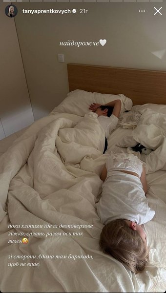 В частности, Татьяна опубликовала фото детей в постели, которое подписала: "Самое дорогое.Пока ребятам едет их двухэтажная кровать, спят вместе вот так вот. Со стороны Адама там баррикады, чтобы не упал".