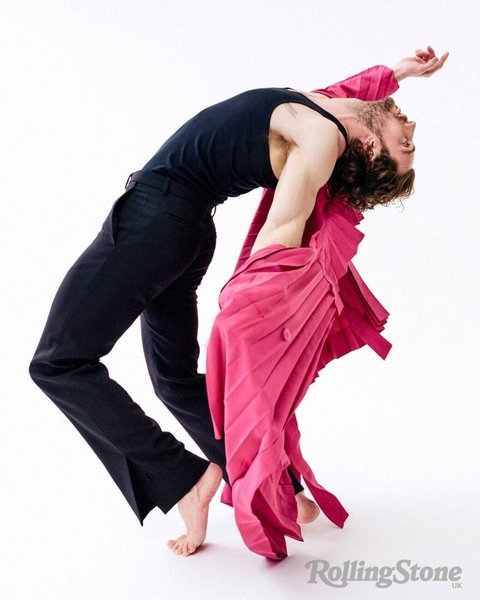 Аарон Тейлор-Джонсон также примерил дизайнерское пальто в оттенках розового от Homme Plisse Issey Miyake, дополнив образ черной майкой от Tom Ford и черными брюками от Lanvin.
