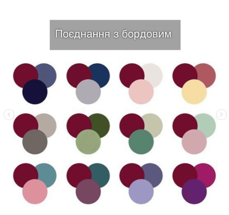 Сочетать марсала и бордо она рекомендует с коричневым, молочным, зеленым, фиолетовым, желтым и розовым цветами.