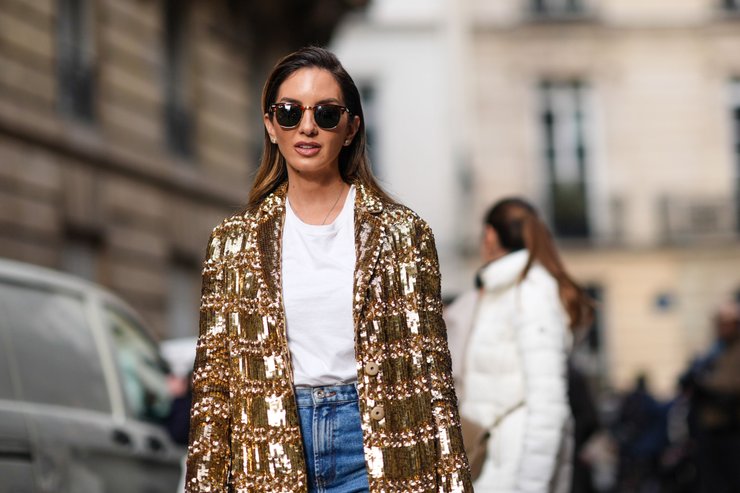 Наряд, в котором драгоценный шик твидового жакета сочетается с непринужденной атмосферой белой майки и джинсов, является удачным примером непринужденной элегантности.