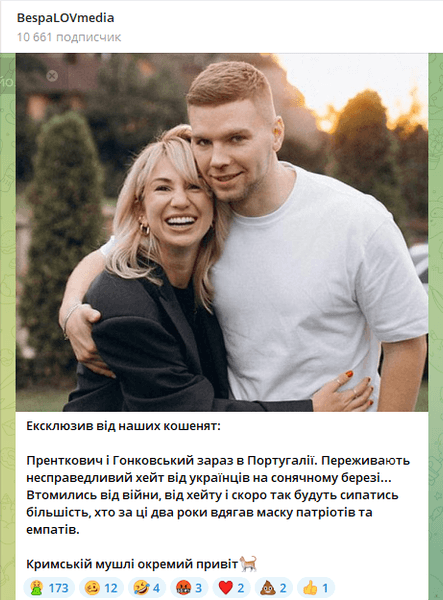"Эксклюзив от наших котят: Пренткович и Гонковский сейчас в Португалии. Переживают несправедливый хейт от украинцев на солнечном берегу... Устали от войны, от хейта и скоро так будут сыпаться большинство, кто за эти два года надевал маску патриотов и эмпатов. Крымской ракушке отдельный привет", — написал блогер.