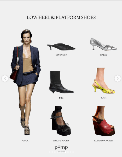 По словам Анастасии Кобыльник, среди каблуков популярными будут невысокие каблуки Kitten Heel и каблуки-рюмочки. А еще подиум заполонит обувь на платформе — особенно массивные лоферы, сабо, клоги.