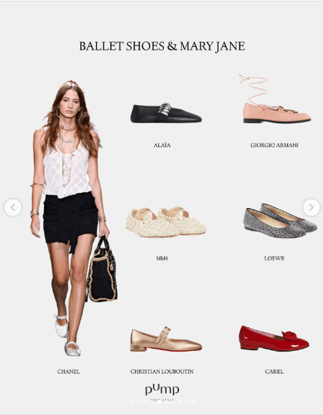 Стилист также рассказала, что эстетика balletcore также нашла место среди трендов этого сезона, поэтому актуальными будут балетки, особенно в модели Mary Jane (с ремешком спереди) — как классические, так и с интересными фактурами: с кристаллами, сетчатые и прозрачные.