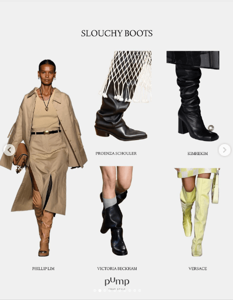 С возвращением эстетики 90-х и нулевых среди трендов на весну 2024 года стилист отмечает сапоги силуэта slouchy, у которых мягкий верх свободно спадает вниз, образуя складки. Такие сапоги однозначно добавят непринужденности и расслабленности в любой образ.