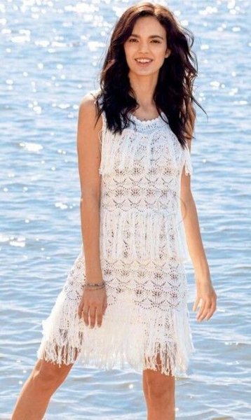 Интересно и маленькое белое платье, выполненная из элегантного белого цветочного кружева с тонкими бретелями и прямым силуэтом.