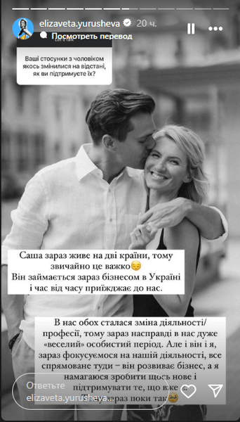 "Саша сейчас живет на две страны, поэтому конечно это тяжело. Он занимается сейчас бизнесом в Украине и время от времени приезжает к нам. У нас обоих произошла смена деятельности, профессии, поэтому сейчас на самом деле у нас очень "веселый" личный период. Но и он, и я, сейчас фокусируемся на нашей деятельности, все направлено туда — он развивает бизнес, а я пытаюсь сделать что-то новое и поддерживать то, что уже есть. Поэтому сейчас пока так", — написала Елизавета Юрушева.