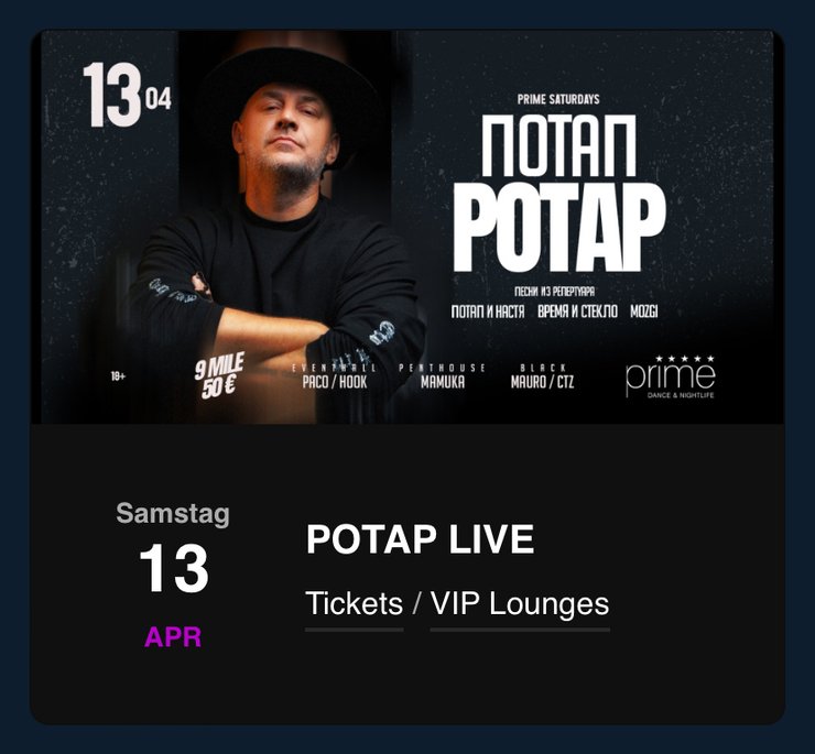 В частности, уже в следующее воскресенье, 14 апреля, в 12:00 часов у Потапа запланировано выступление в городе Оффенбах (Германия). На афише, которая была обнародована на официальном сайте организаторов, концерт Потапа анонсировали как "RUSSIAN RETRO". Также на ней указано, что рэпер будет исполнять русскоязычные хиты из репертуаров групп "Потап и Настя", "Время и Стекло", "Mozgi".