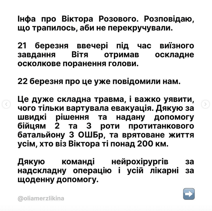 Она отметила, что семья узнала о ранении на следующий день 22 марта. Розовый получил очень сложную травму, однако его эвакуировали из зоны боевых действий.