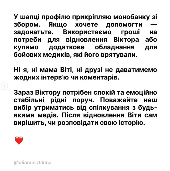 "Спасибо за быстрые решения и оказанную помощь бойцам 2 и 3 роты противотанкового батальона 3 ОШбр, и спасенную жизнь всем, кто вез Виктора те более 200 км", — отметила его жена.