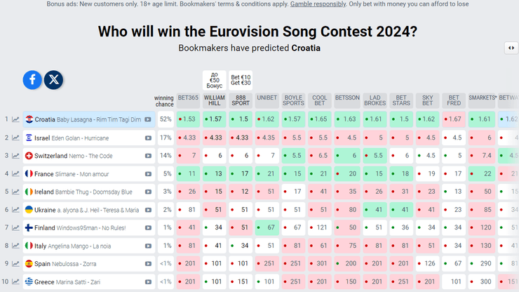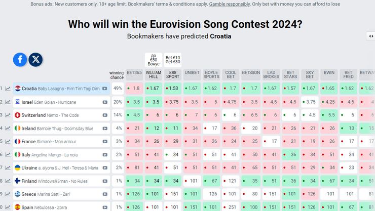 00:26 Голосование продолжается, а букмекеры вернули Украину на 6 место. Тройка фаворитов не изменилась: Хорватия, Израиль и Швейцария.