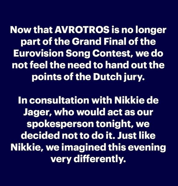 22:00 Нидерландская телекомпания AVROTROS заявила, что поскольку не является частью жюри, то не будет объявлять баллы гранд-финала.
