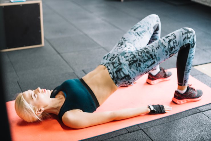 - Поднимите бедра от пола, пока колени, бедра и плечи не образуют прямую линию.