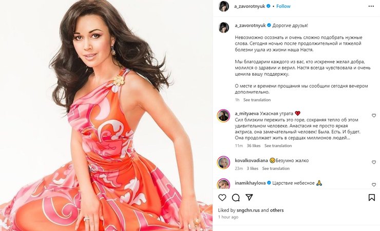 "Дорогие друзья! Невозможно осознать и очень сложно подобрать нужные слова. Сегодня ночью после продолжительной и тяжелой болезни ушла из жизни наша Настя. Мы благодарим каждого из вас, кто искренне желал добра, молился о здравии и верил. Настя всегда чувствовала и очень ценила вашу поддержку. О месте и времени прощания мы сообщим сегодня вечером дополнительно", – говорится в публикации.