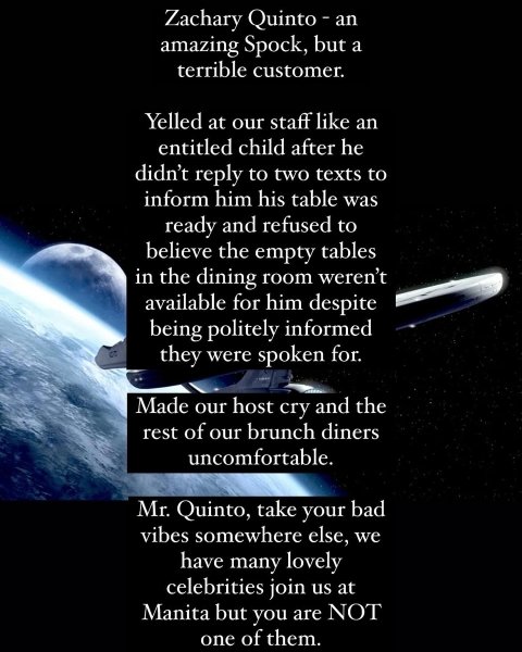 "Закари Куинто — потрясающий Спок, но ужасный клиент. Кричал на наших сотрудников, как ребенок, у которого есть все права, после того, как он не ответил на два сообщения, информировавших его, что его стол готов, и отказывался верить, что пустые столики в зале для него недоступны, несмотря на то, что ему вежливо сообщили, что они забронированы", – пишут сотрудники ресторана.