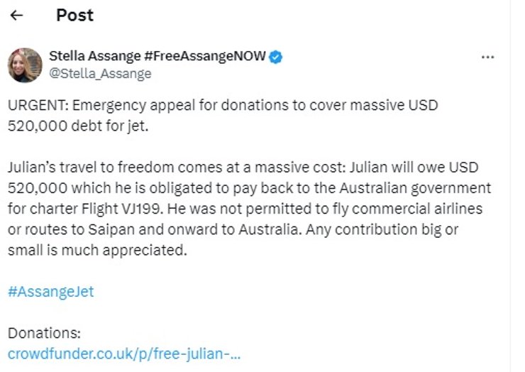 В сообщении на X Стелла Ассанж попросила своих сторонников помочь покрыть "огромный долг в размере $520 тысяч долларов США" австралийскому правительству за чартерный рейс. Ее мужу не разрешили лететь коммерческими авиалиниями на Сайпан и далее в Австралию.