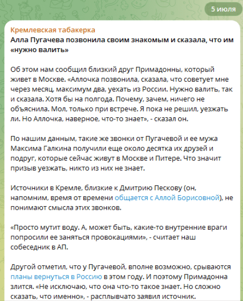 В частности, мужчина рассказал, что Алла Пугачева звонила нескольким своим друзьям из России и побуждала их покинуть территорию РФ. Певица отметила, что из страны "нужно валить" на это у россиян есть максимум месяц или два. Пугачева отметила, что уехать из России стоит хотя бы на минимум полгода. Однако несмотря на призывы покинуть страну-агрессора певица не объяснила друзьям причину, по которой они должны это сделать. Объяснить она по телефону не смогла, ведь заявила, что может рассказать о реальных причинах только по телефону.