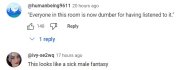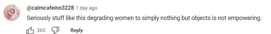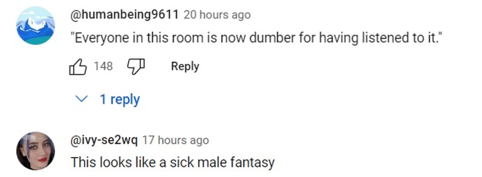 "Все в этой комнате теперь тупее, потому что слушали это", "Это похоже на больную мужскую фантазию", "Это соотношение просто сумасшедшее. От 385 до 583 тысяч тем, кто не видит дизлайков", Серьезно, подобные вещи, унижающие женщин до состояния ничего, кроме предметов, не расширяют их возможностей", "Я не понимаю, текст песни явно создан для продвижения сильных, умных, влиятельных женщин. Тем не менее видео просто показывает, как они намеренно сводят себя к сексуальным объектам и некомпетентны в повседневных задачах. Я знаю много очень влиятельных женщин, и все они скорее умрут, чем поведут себя таким образом", – пишут в комментариях под видео пользователи.