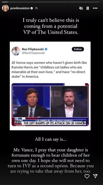 55-летняя американская актриса и продюсер Дженнифер Энистон раскритиковала высказывания сенатора Джей Ди Вэнса, потенциального вице-президента США в случае победы Дональда Трампа на выборах президента США в ноябре, по поводу "бездетных кошатниц" которые несчастны в своей жизни. Об этом говорится в сторис Instagram звезды.