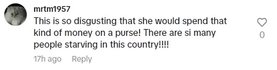"$70 000, и люди здесь голодают. Этот мир сошел с ума", "У некоторых детей нет денег на обед", "Б/у за $70 000?! А я тут выбираю между выгодным предложением на обед или упаковкой из шести бутылок, потому что не могу позволить себе и то, и другое", "Я учитель, это больше моей годовой зарплаты", "Это почти столько же, сколько стоит мой дом", "Грустно, сколько денег тратят знаменитости, а ведь они могли бы помогать людям или благотворительным организациям", "Это так отвратительно, что она тратит такие деньги на сумочку! В этой стране так много людей голодает".