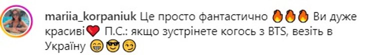 "Это просто фантастически! Вы очень красивы. П.С.: если встретите кого-нибудь из BTS, везите в Украину", "Как всегда красавица среди красоты! Моя мечта посетить эту красивую и колоритную страну", "Это и моя мечта, но пока отложена в дальний ящик) Хороший ханбок", "Очень неожиданное место и еще какое экзотическое. Привыкли Киев – Хмельницкий. Что-то новое начинается…?", "Хюррем уже не интересно .., теперь Ивановна "Царица Поднебесной"", – пишут в комментариях.
