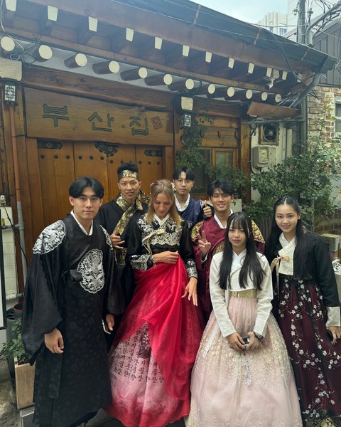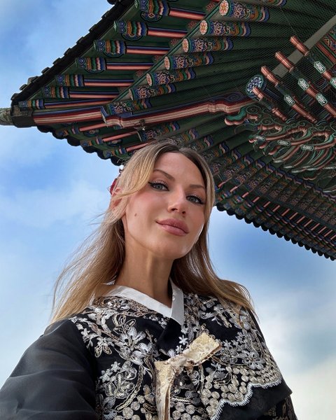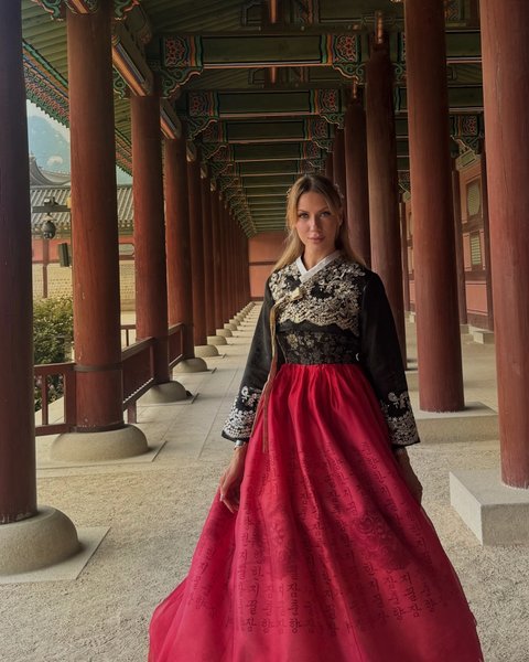 На Лесе – черное чогори, отделанное белыми узорами, и красно-черно-белая юбка с иероглифами с полупрозрачным красным верхом. Она позирует на фоне храма, демонстрирует роскошные пейзажи и даже сфотографировалась с несколькими корейцами в национальной одежде и показала девушек в праздничных нарядах.