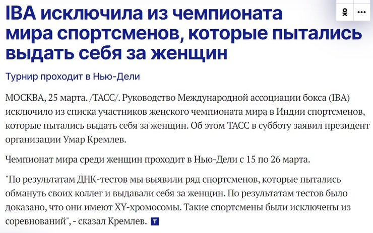 "У нас есть две боксерши, которые родились женщинами, были воспитаны как женщины, имеют паспорт женщин и много лет выступали как женщины. Это четкое определение женщины. Никогда не было никаких сомнений в том, что они женщины", – цитирует его AP.