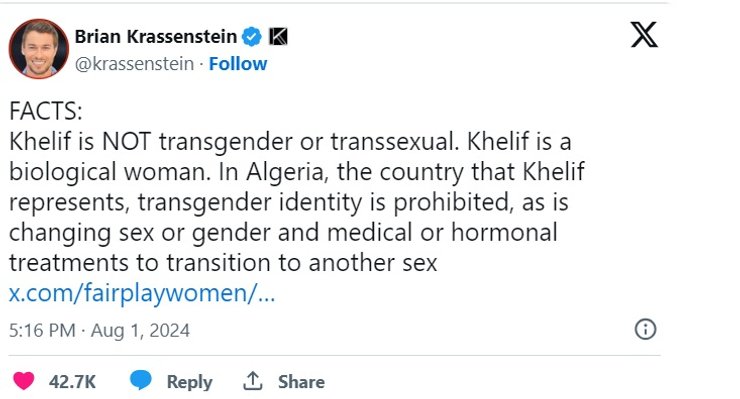 "Факты: Хелиф не трансгендер и не транссексуал. Хелиф — биологическая женщина. В Алжире, стране, которую представляет Хелиф, трансгендерная идентичность запрещена, как и смена пола или гендера, а также медицинское или гормональное лечение для перехода в другой пол", – говорится в его твите.