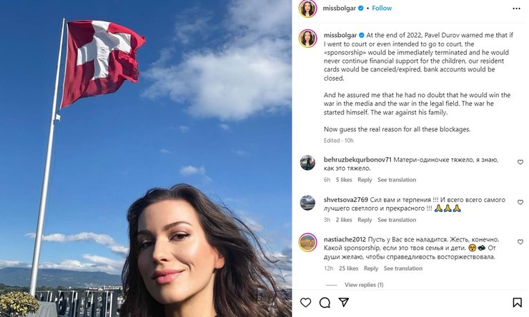 "Мне постоянно давали заверения и обещания, в которые я искренне верила, что у меня и моих детей всегда будет доступ к нашим семейным ресурсам, несмотря на то, что наш брак официально не был зарегистрирован, а совместно нажитое имущество, включая основной актив — мессенджер Telegram — было зарегистрировано исключительно на него. Я также доверяла его обещаниям и заверениям о том, что для детей будут созданы трастовые фонды, гарантирующие их финансовую безопасность", – написала она.